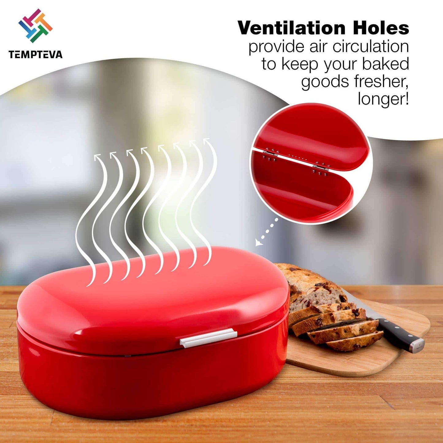 Keep your bread, crackers, biscuits, and muffins fresh with the Tempteva Metal Bread Box Boasting a unique, rounded shape that exudes ergonomic beauty and style. The non-airtight lid ensures your dry foods will keep from getting stale while the ventilation holes promote optimal airflow preventing moisture buildup. These stylish bread boxes guarantee long-lasting freshness and taste.