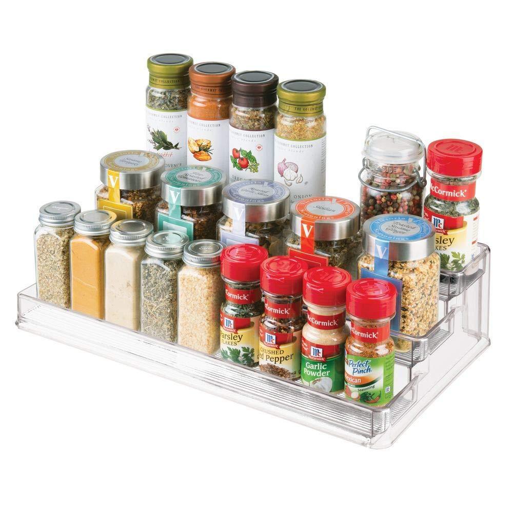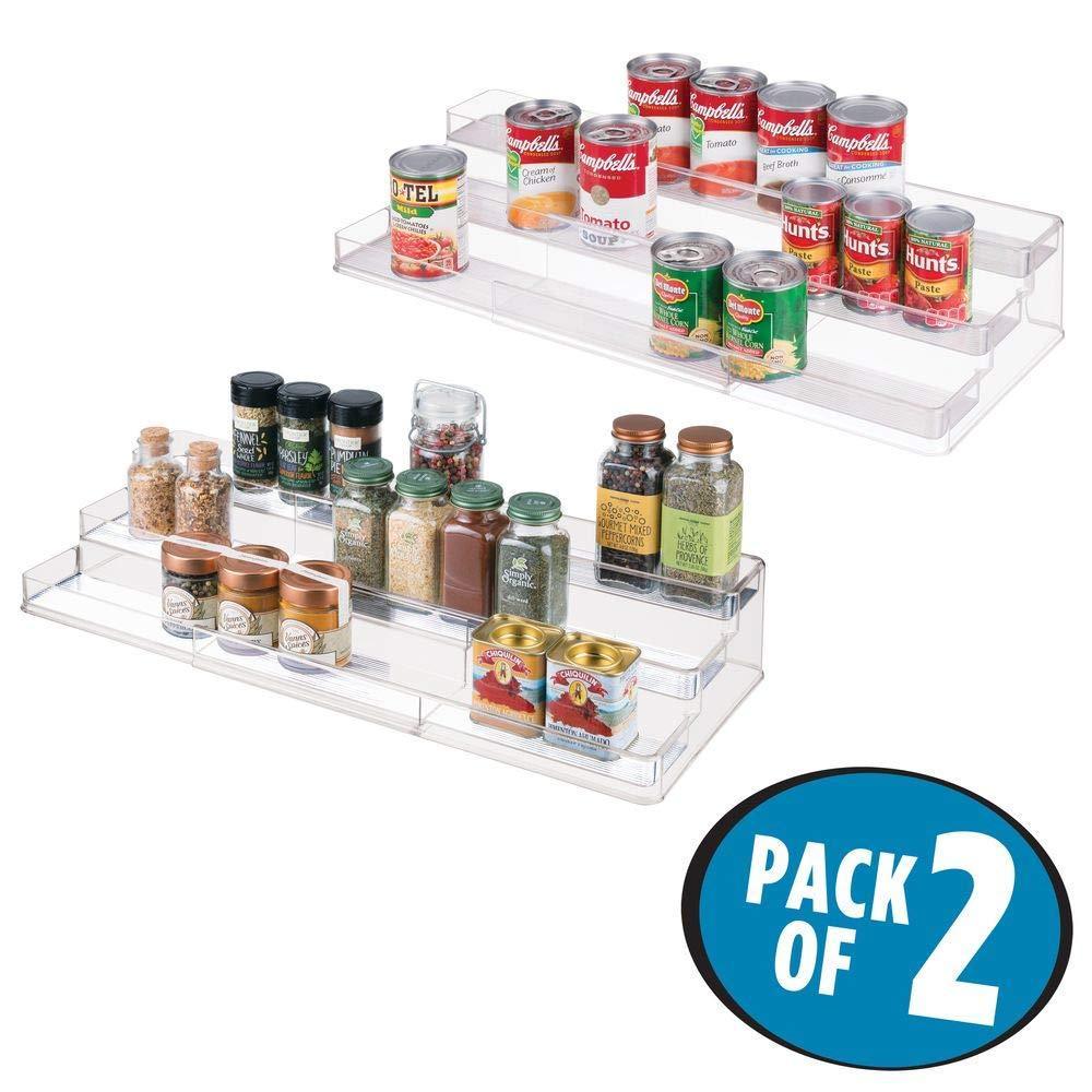 mDesign Large Plastic Adjustable, Expandable Kitchen Cabinet, Pantry, Shelf Organizer/Spice Rack with 3 Tiered Levels of Storage for Spice Bottles, Jars, Seasonings, Baking Supplies - 2 Pack - Clear