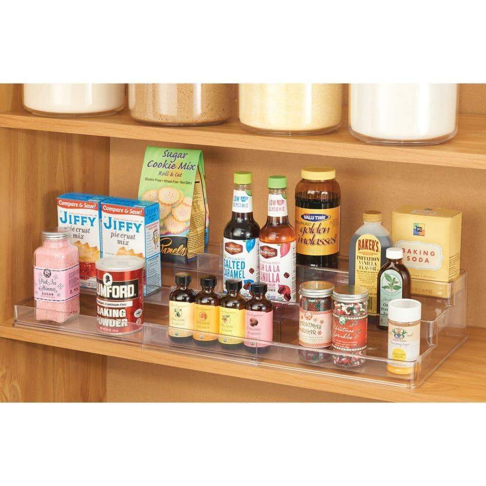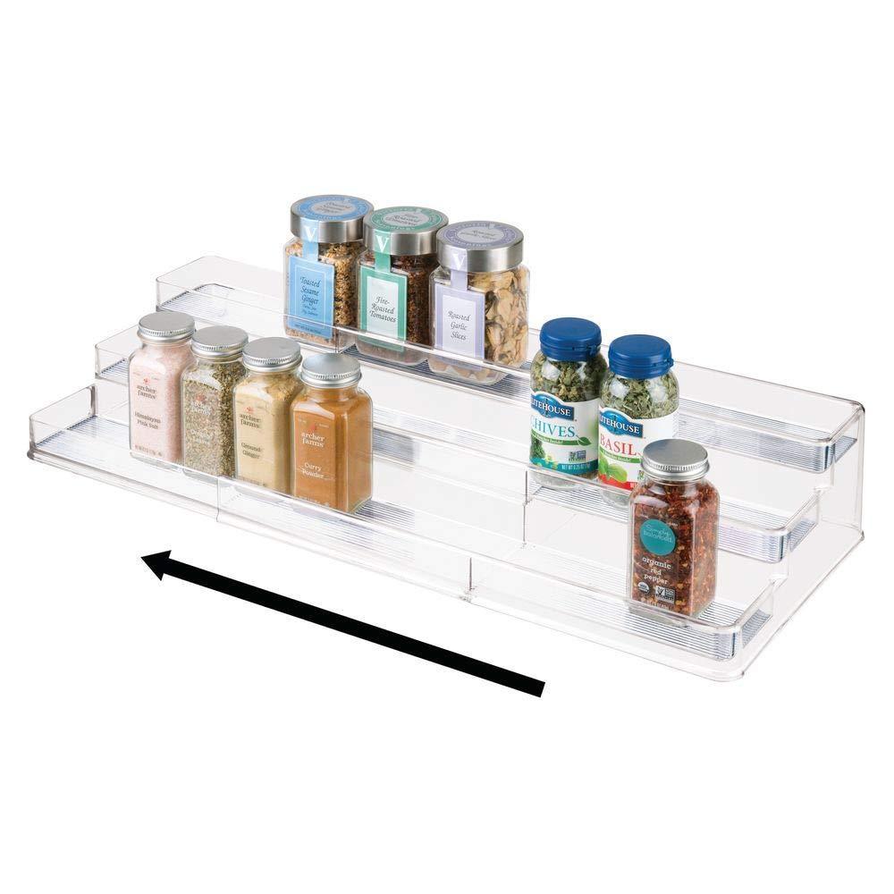Details: The mDesign Expandable Tiered Storage Shelf makes the most of the storage space on your kitchen counter tops or in kitchen cabinets with its customizable design. The tiered design makes it easy to see what's stored on each level and quickly grab what you need. The raised edge around each shelf keeps spices, canned goods, baking supplies, boxed goods and more in place. Customize to cabinet and countertop spaces by expanding the shelf for a perfect fit.