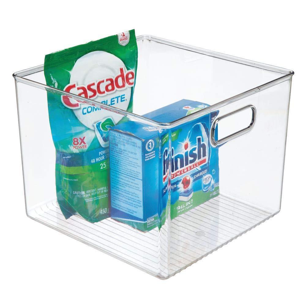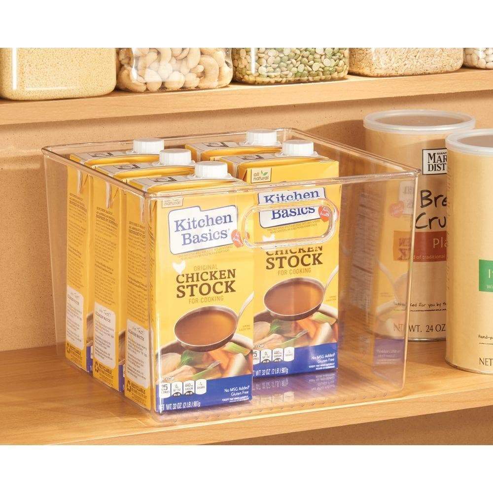 - PORTABLE: Bins feature easy-carry handles to make it simple to transport goods from pantry to shelf to table; Just grab and go; These storage baskets stack too - the perfect storage and organizing solution for modern kitchens and pantries; Open tops and clear construction make it easy to see what is inside and quickly grab what you need; Try these in the cabinet or cupboard under your sink for cleaning or dishwashing supplies or for storing boxes of kitchen liners and garbage bags