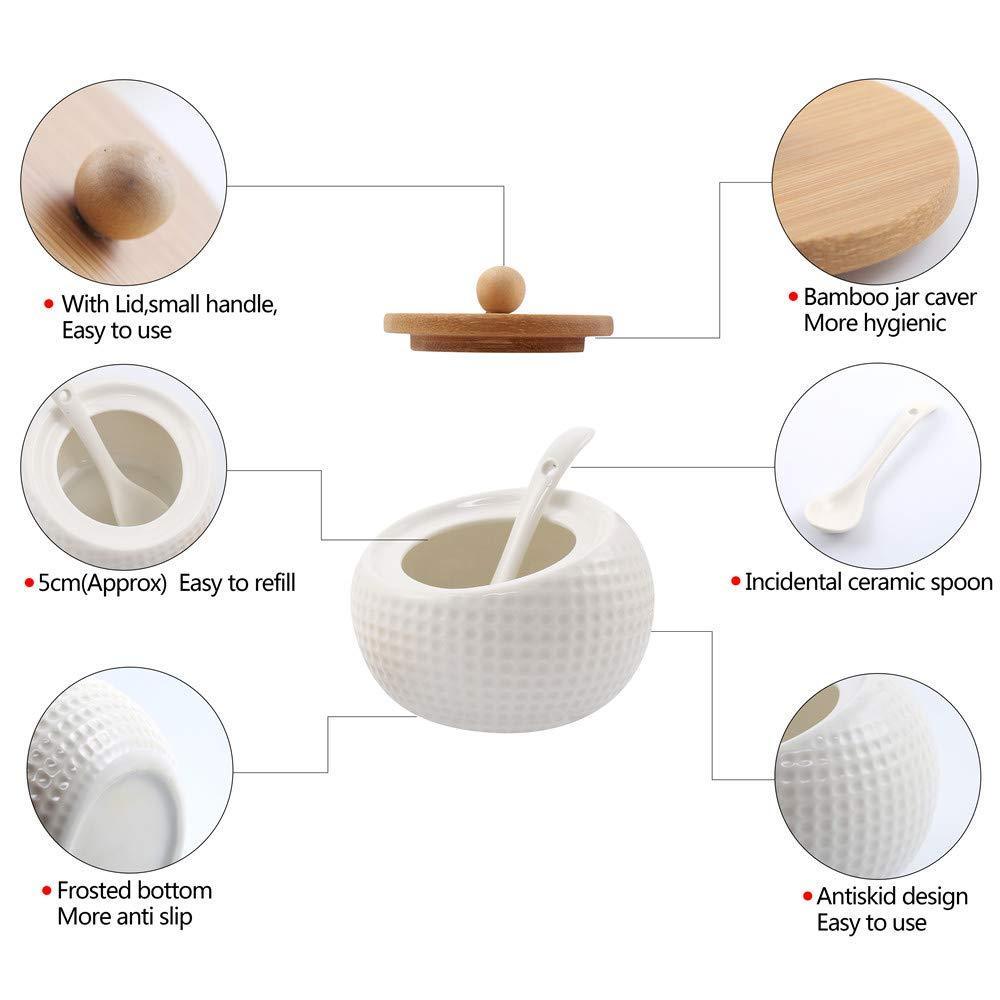 Porcelain Condiment Jar Spice Container with Lids - Bamboo Cap Holder Spot, Ceramic Serving Spoon, Wooden Tray - Best Pottery Cruet Pot for Your Home, Kitchen, Counter. White,170 ML (5.8 OZ), Set of 3