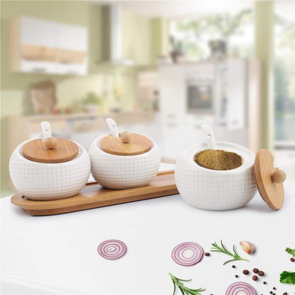 -Ceramic Condiment Pot Set gives your kitchen a more organized look. These three storages with lid and spoon are made with white ceramic and bamboo material in the wood.