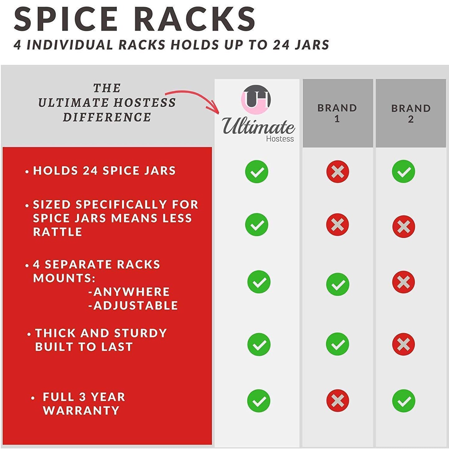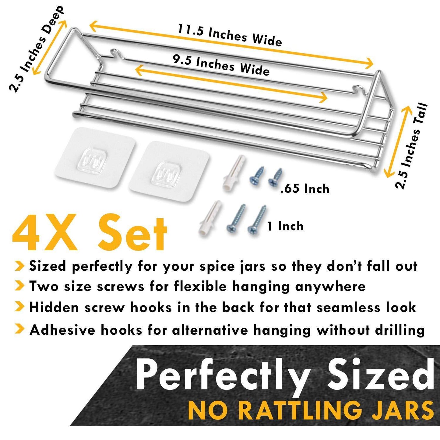 Details: This set of 4 chrome, single mounted spice racks from Ultimate Hostess will make organization easy in your kitchen, bathroom, craft room, garage or any place you need to get organized at home. Finding things in pantries will be a snap. Set them on a shelf or mount them on the inside of a closet or cabinet door. Because they are mounted individually and adjustable, you can decide how many you need and where. Our hanging design will make sure each racks hangs securely in place. Plus, each set comes complete mounting hardware which includes two size screws (1/2 in and 1 inch), as well as adhesive hooks so you have options depending on the thickness of your mounting surface. Each rack measures 2.5 inches in height and depth (2 inches of usable space) and 11.5 inches in length allowing for a more secure fit for your spice jars. Each mounting hook is located 1 inch from each end and 9.5 inches from one another. With our improved sizing, there will be less rattling and movement of your spice jars in our rack compared to the competitor.