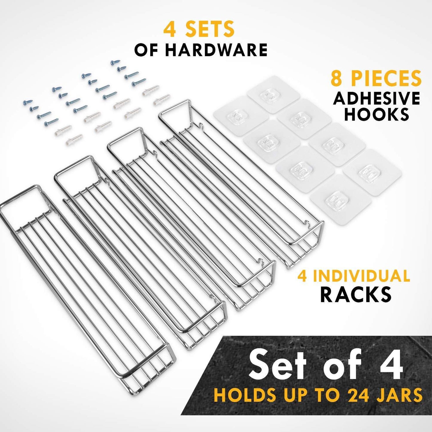 - USE JUST ONE OR ALL FOUR - Since each rack is hung separately, you can decide how much space between the racks. Hang them closer together for smaller jars, or further apart for larger/taller supplies. Hang one or all four - you decide what works best for you.