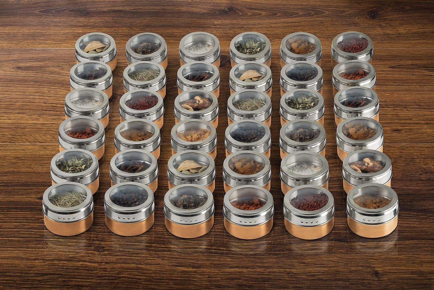 Stainless Steel Magnetic Spice Jars - Bonus Measuring Spoon Set - Airtight Kitchen Storage Containers - Stack on Fridge to Save Counter & Cupboard Space - 36pc Organizers in Gold